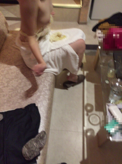 知らないおっさん連中に股間を触られ、上にまたがって腰をカクカクやる彼女。
