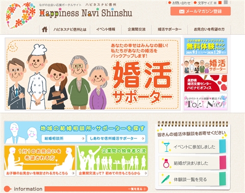 特に結婚を希望している方は「長野県婚活支援センター(電話番号:026-235-7373)」の婚活コーディネーターが@出会いの相談・お見合いのお世話A出会いに関するイベント情報等の提供B結婚相談・アドバイスC県が実施する結婚支援事業への協力D結婚できない人を支援する活動などを行っています。